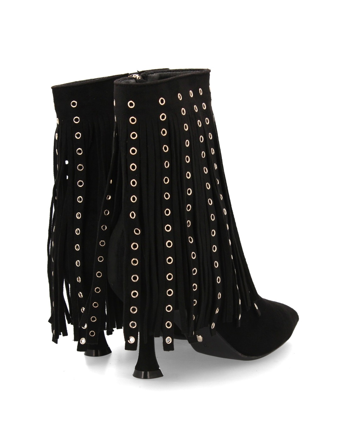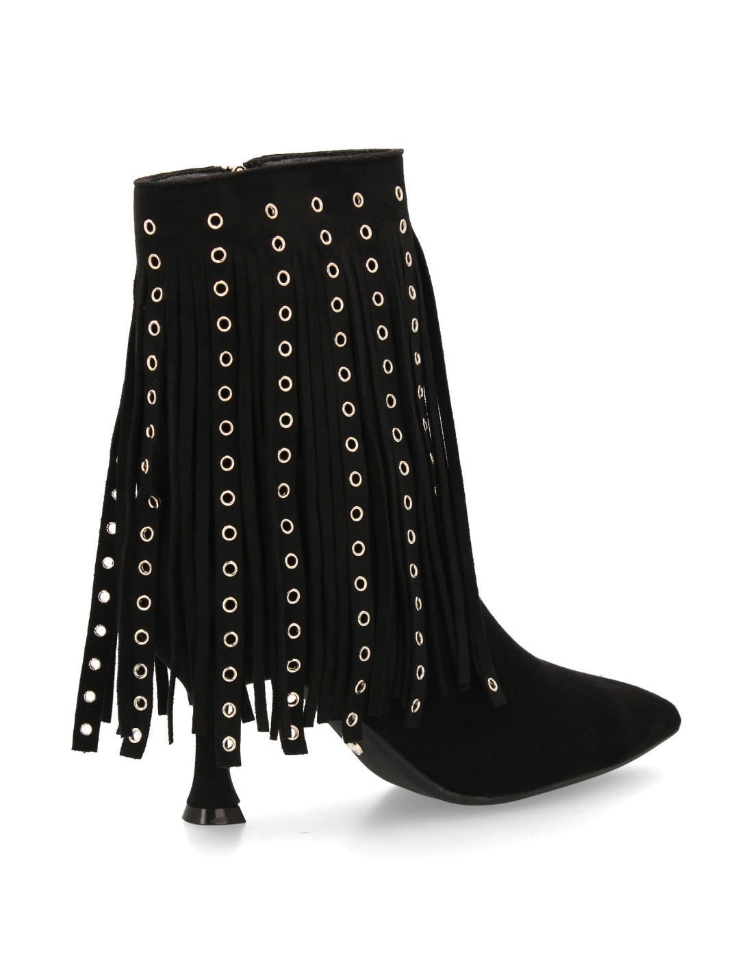 Botín de mujer con diseño de caña adornada con flecos largos y ojales metálicos. Acabado en punta y tacón fino. Cierre lateral con cremallera ideal temporada otoño invierno.