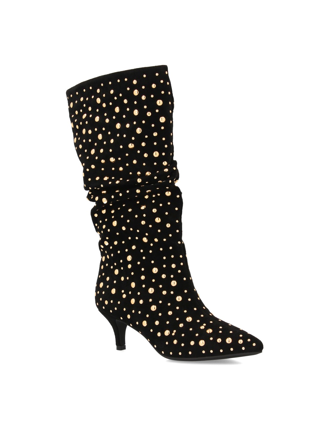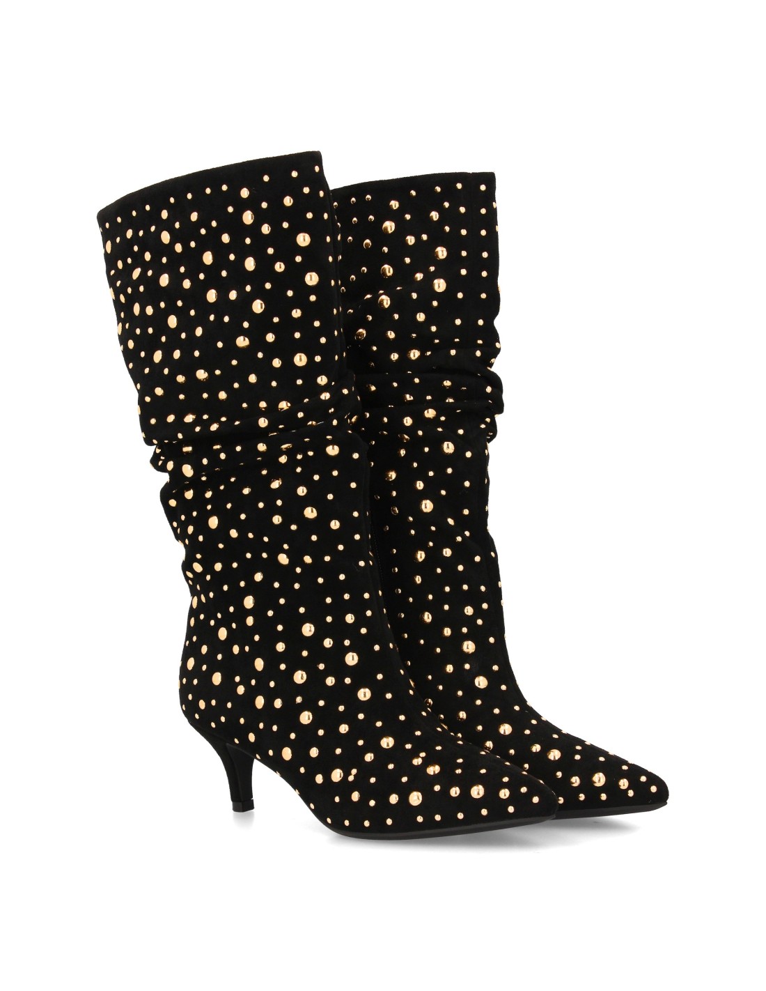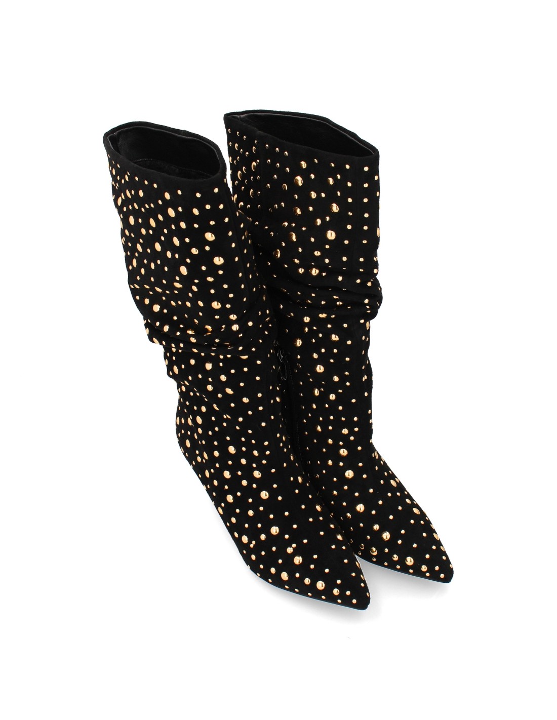 Bota de mujer de caña arrugada decorada con tachuelas metálicas brillantes tipo pedrería. Fruncido, tacon fino, punta fina. Ideal para temporada Otoño invierno.