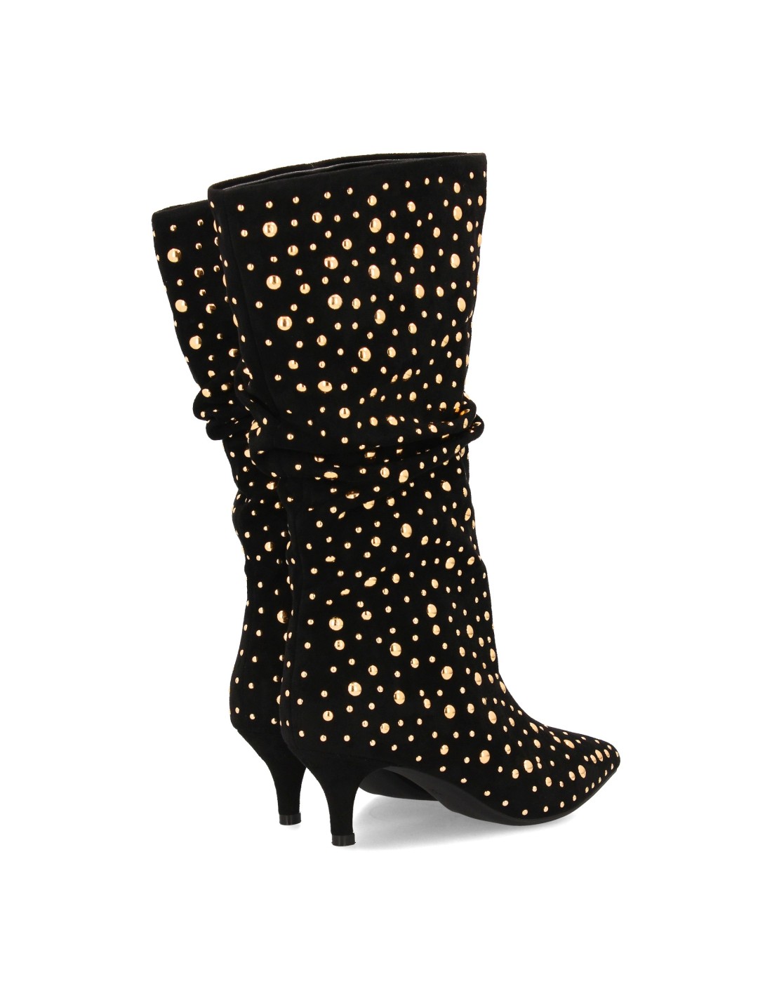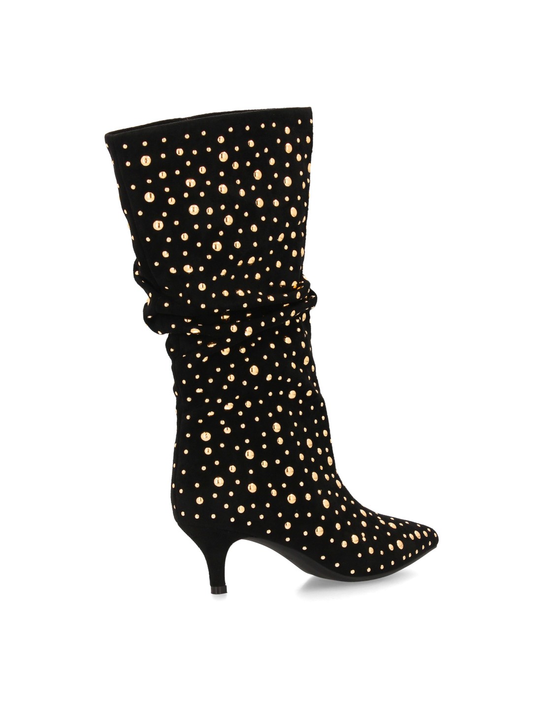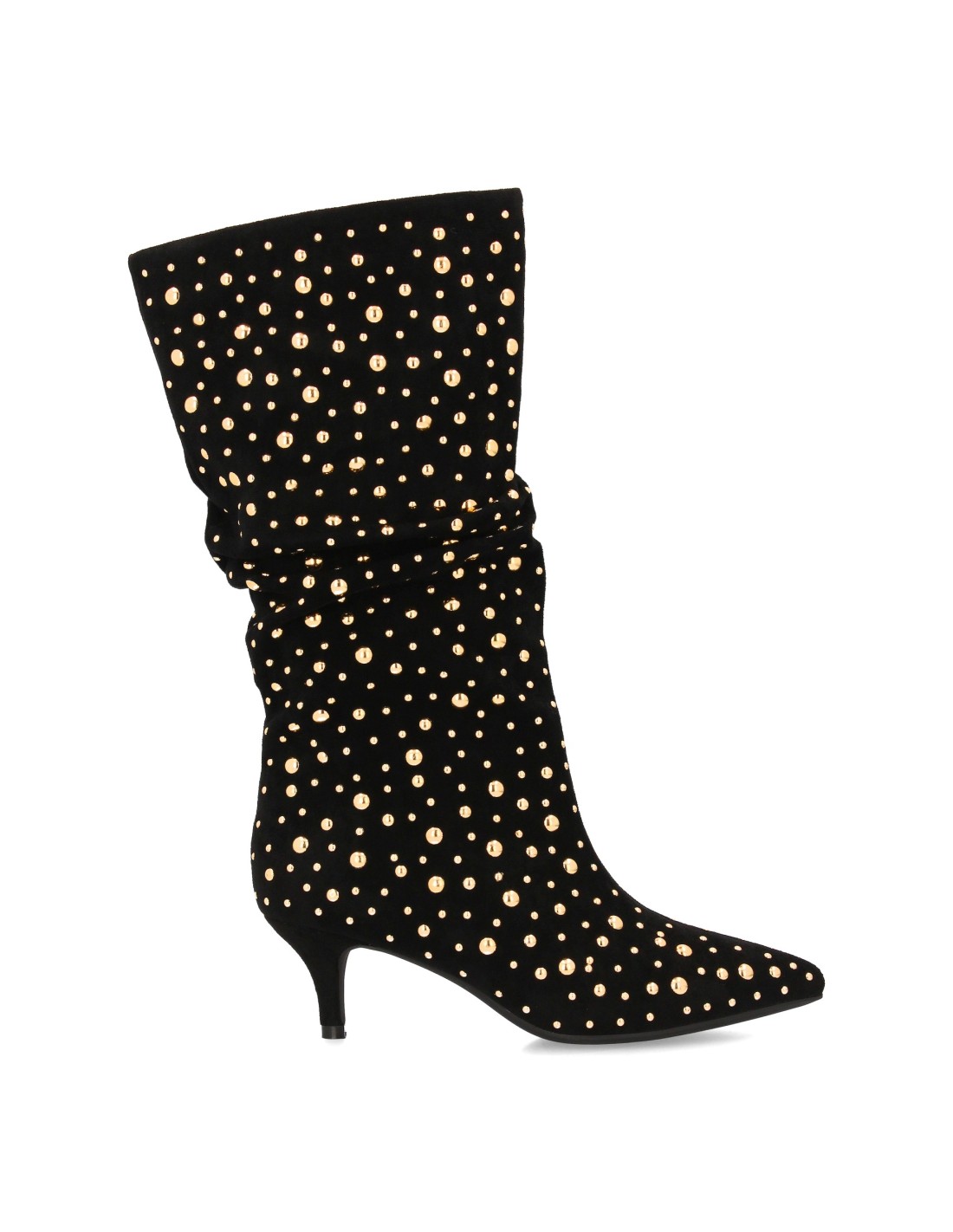 Bota de mujer de caña arrugada decorada con tachuelas metálicas brillantes tipo pedrería. Fruncido, tacon fino, punta fina. Ideal para temporada Otoño invierno.