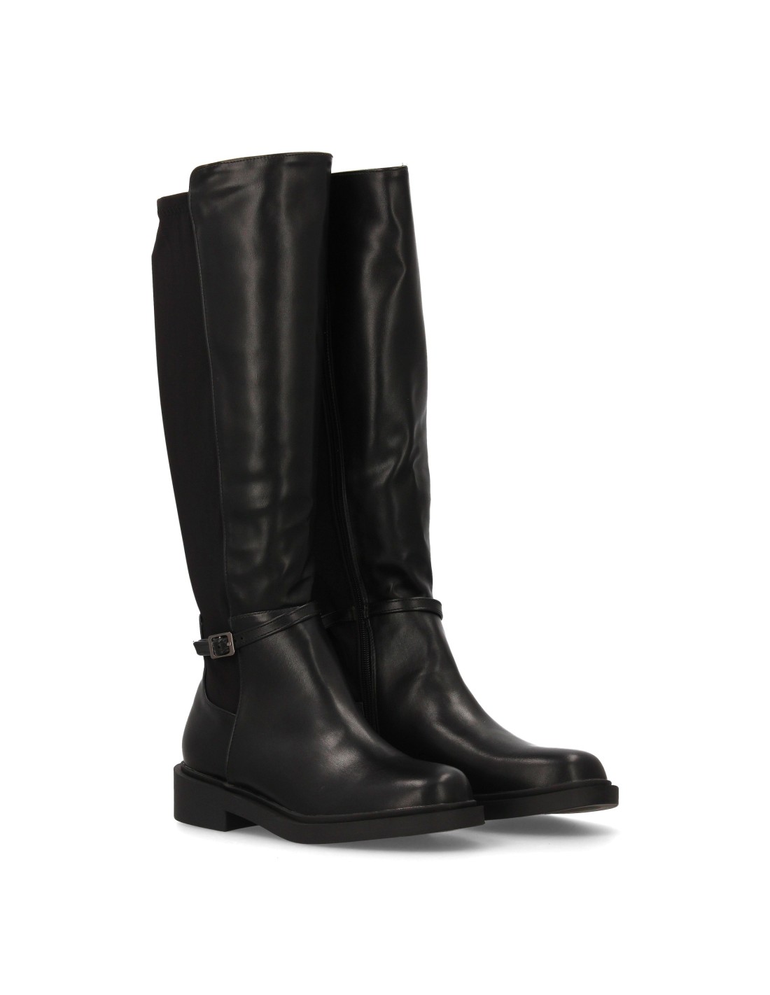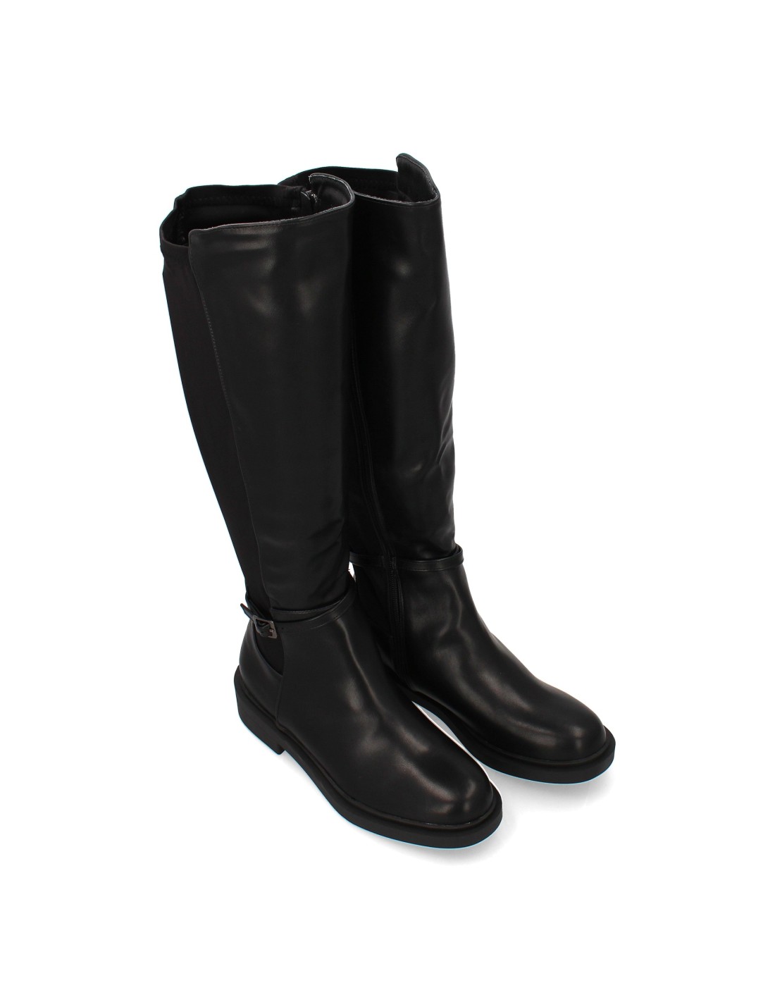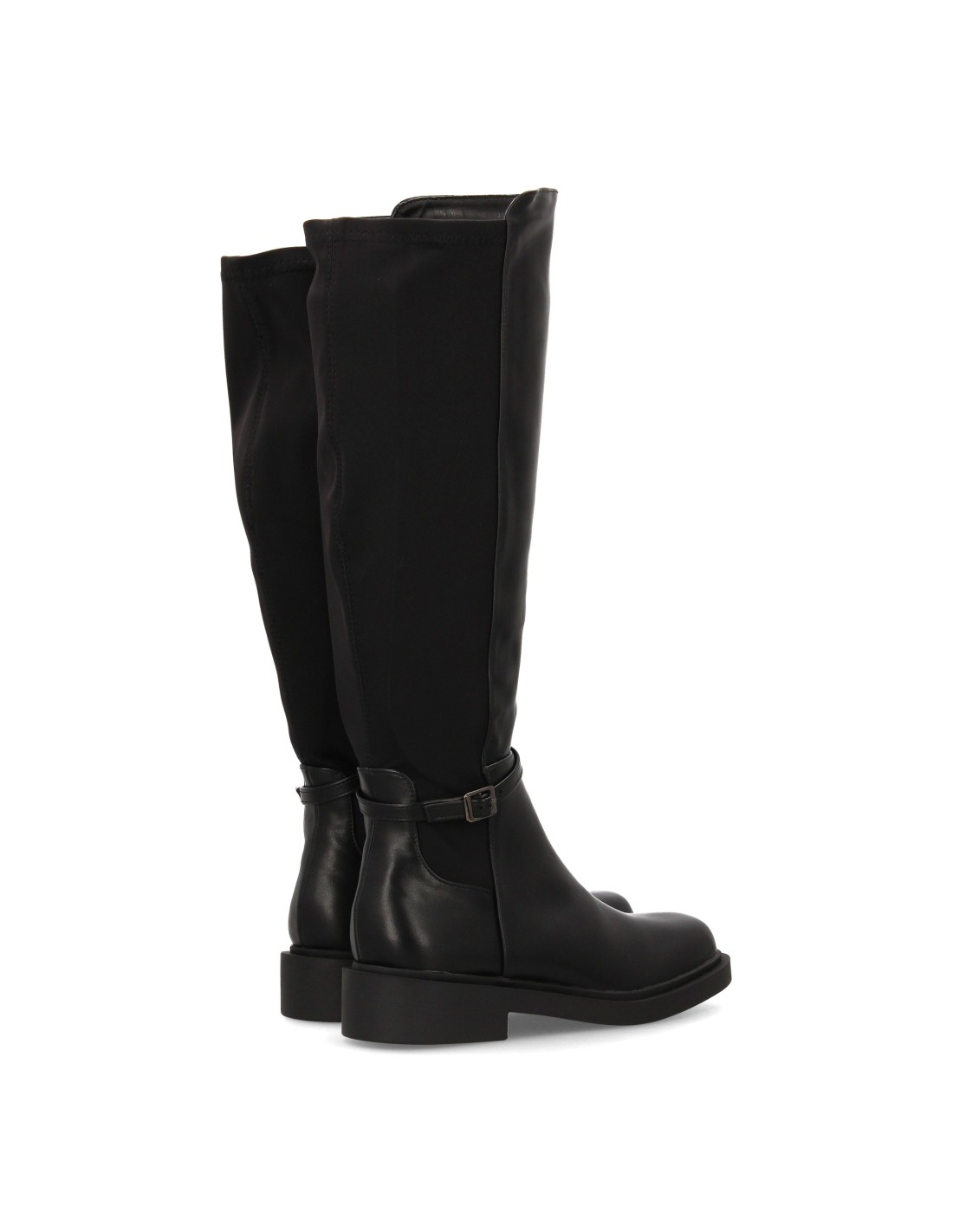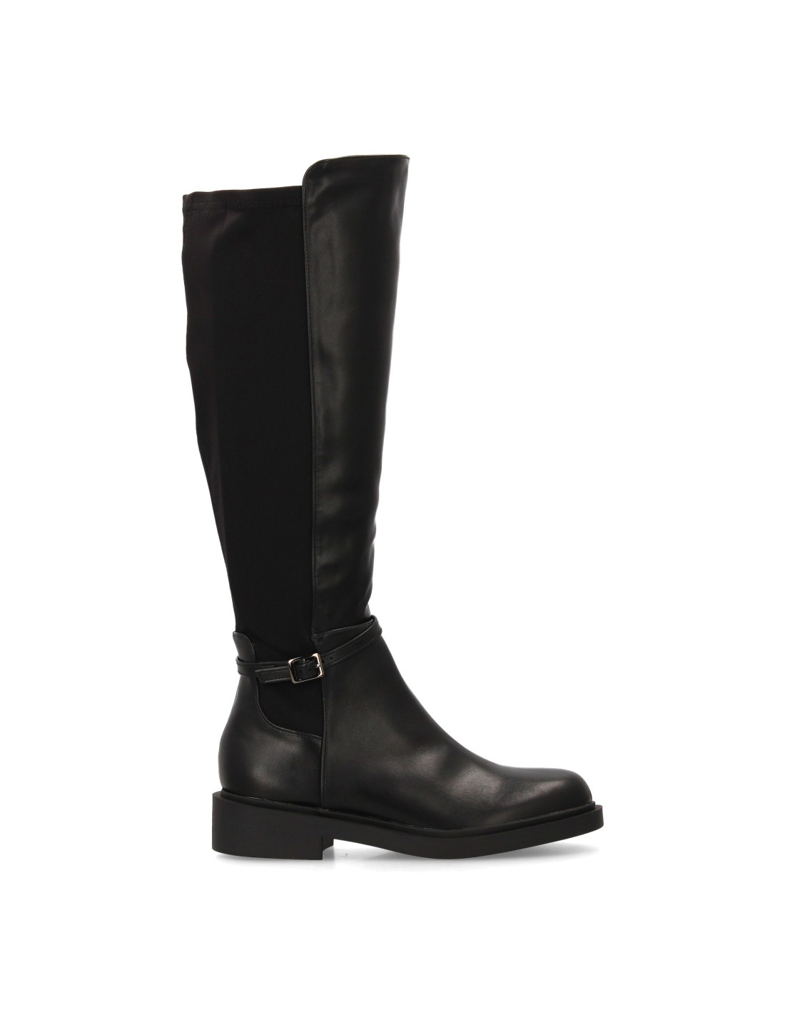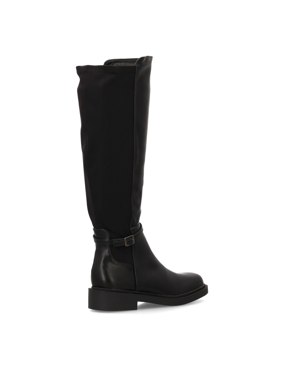 Bota alta para mujer con caña combinada en material sintético y tejido elástico. Su diseño tipo ecuestre incorpora una hebilla decorativa en el tobillo y suela plana con tacón bajo para el día a día