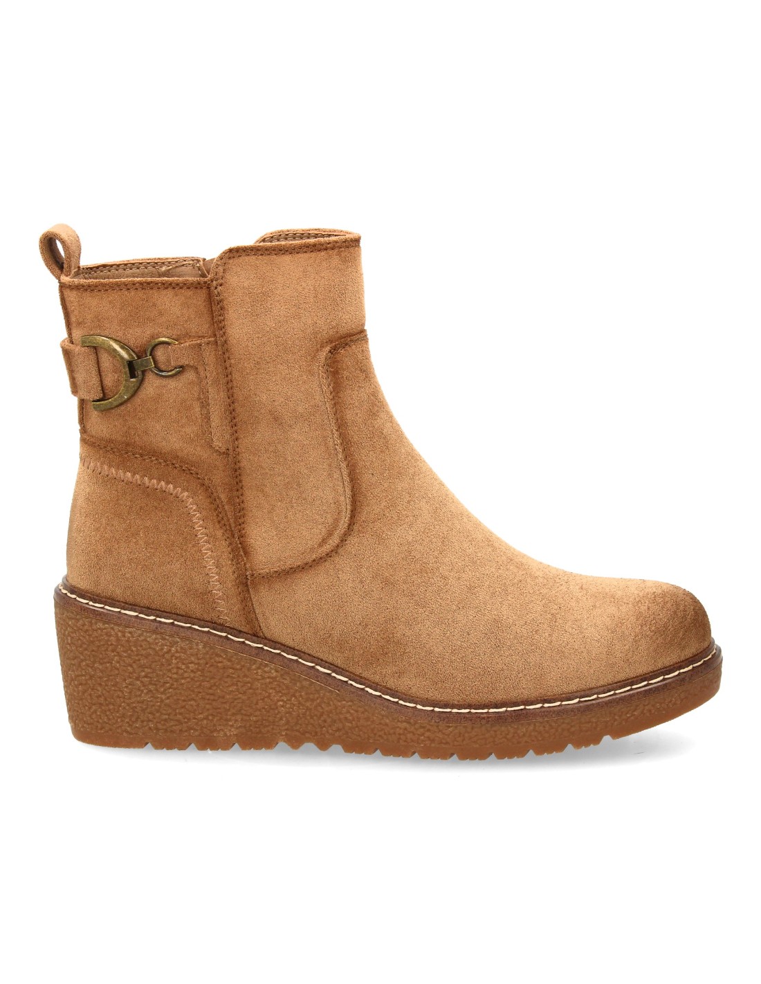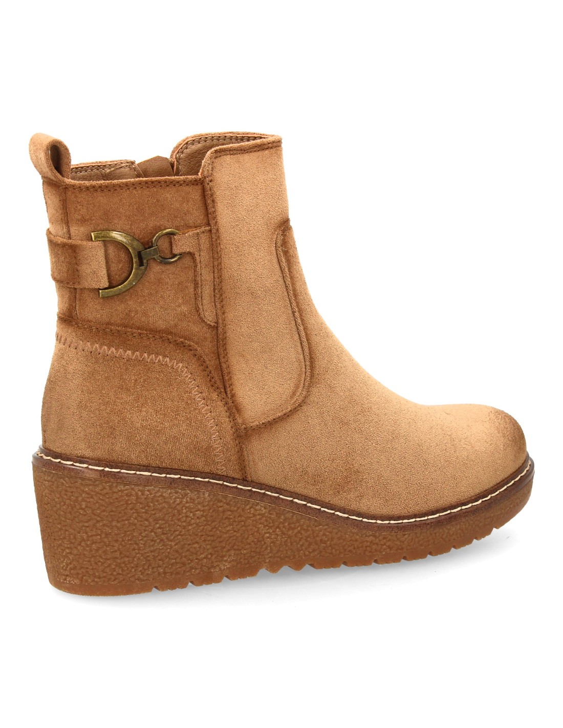 Botín para mujer con cuña cómoda para usar en el día a día. Diseño de adorno metálico lateral con estribo, cierre interior de cremallera.