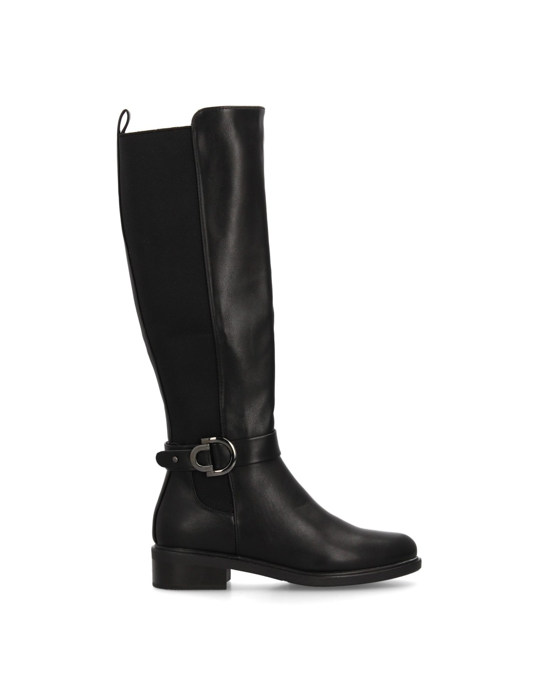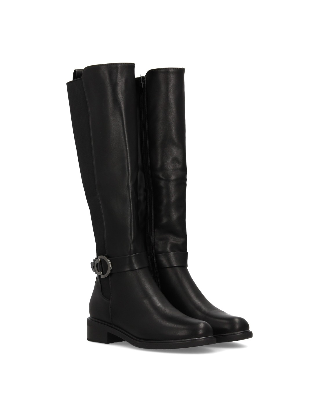 Bota alta de mujer con caña lisa para mujer. Cierre de cremallera, suela plana con tacón bajo. Hebilla decorativa. Ideal temporada otoño invierno.