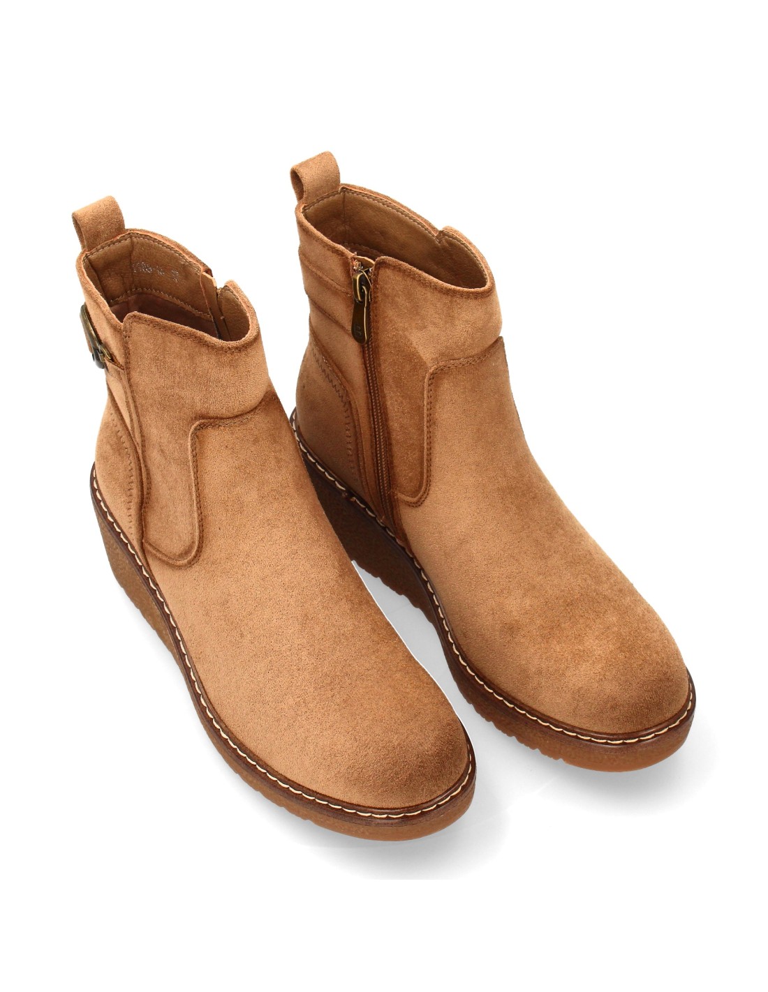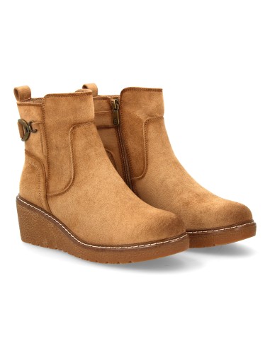 Botín para mujer con cuña cómoda para usar en el día a día. Diseño de adorno metálico lateral con estribo, cierre interior de cremallera.