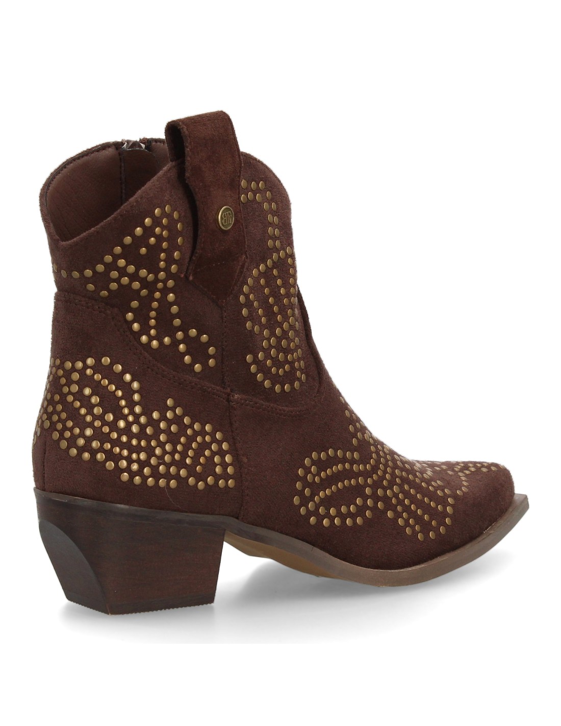 Botín campero con adorno de tachuelas metálicas, punta fina y tacón bajo. Para la temporada Otoño Invierno. Ideal para mujer.
