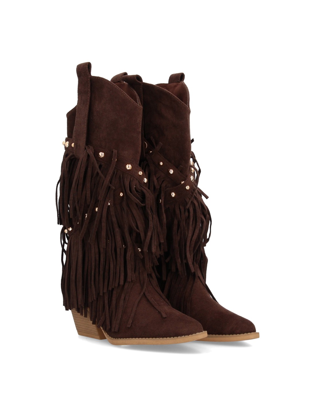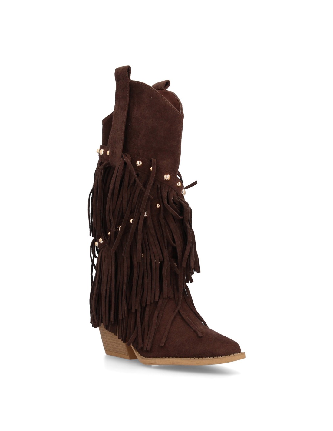 Bota de estilo western con caña alta decorada con flecos en cascada y tachuelas metálicas, punta fina y tacón cubano. Ideal para mujer en temporada de Otoño Invierno
