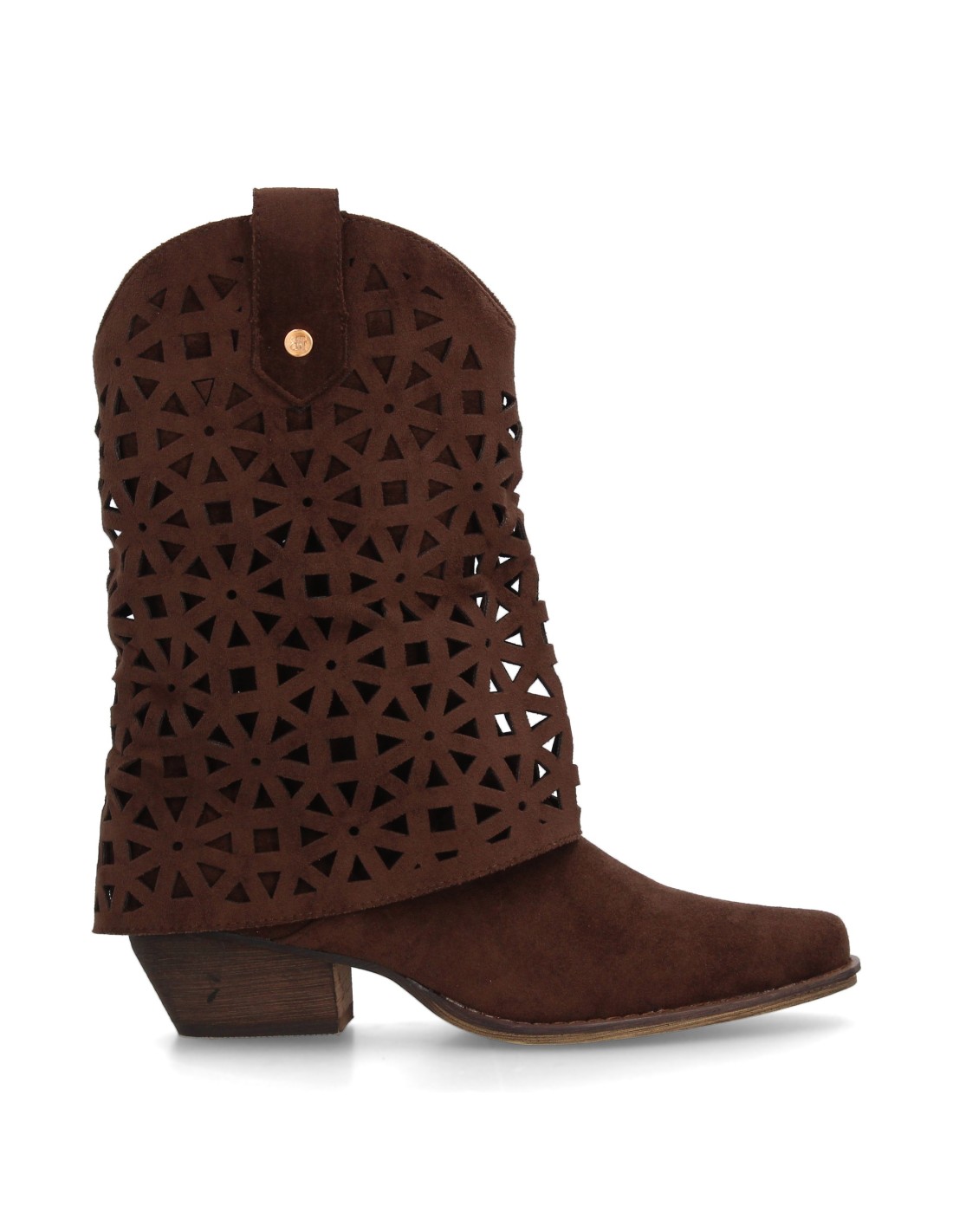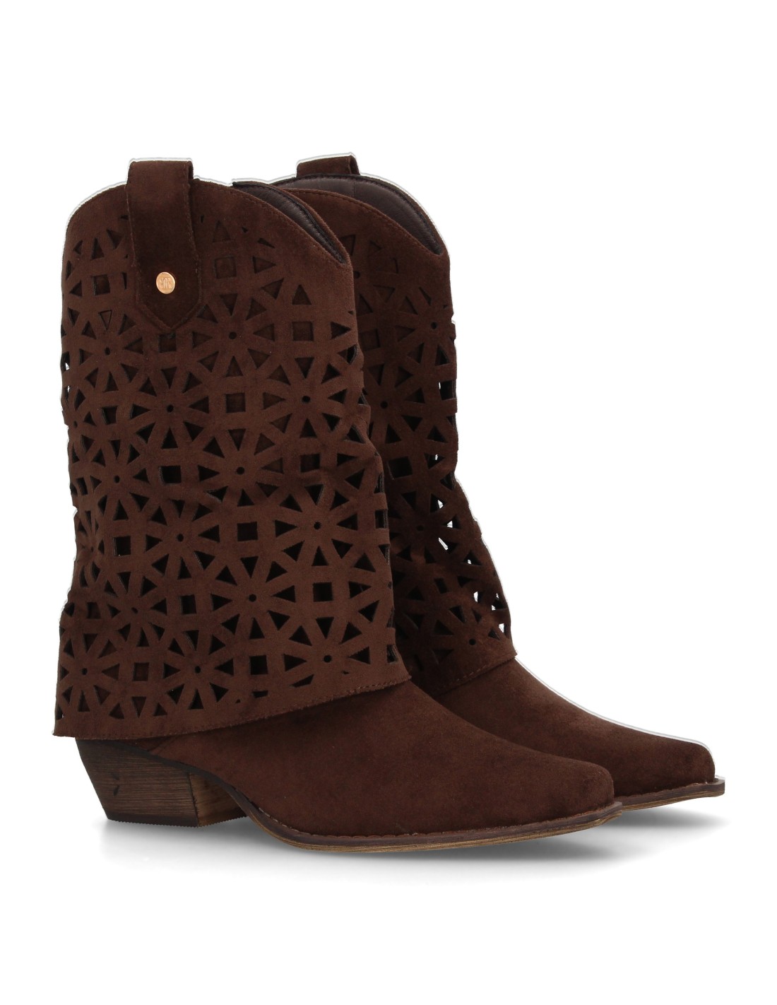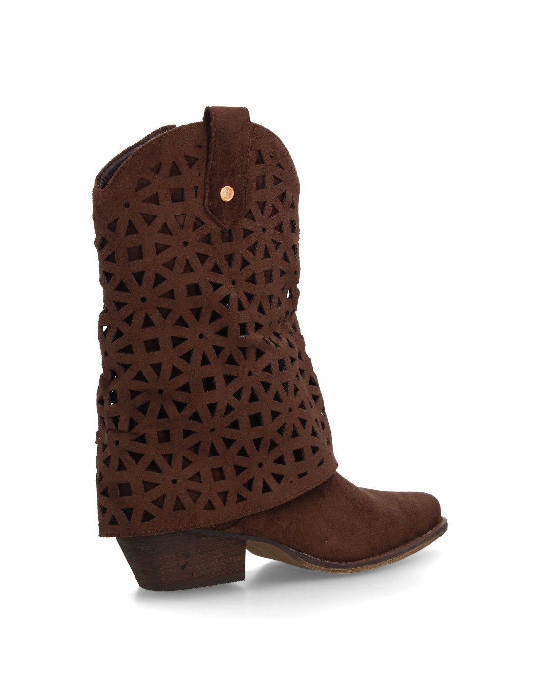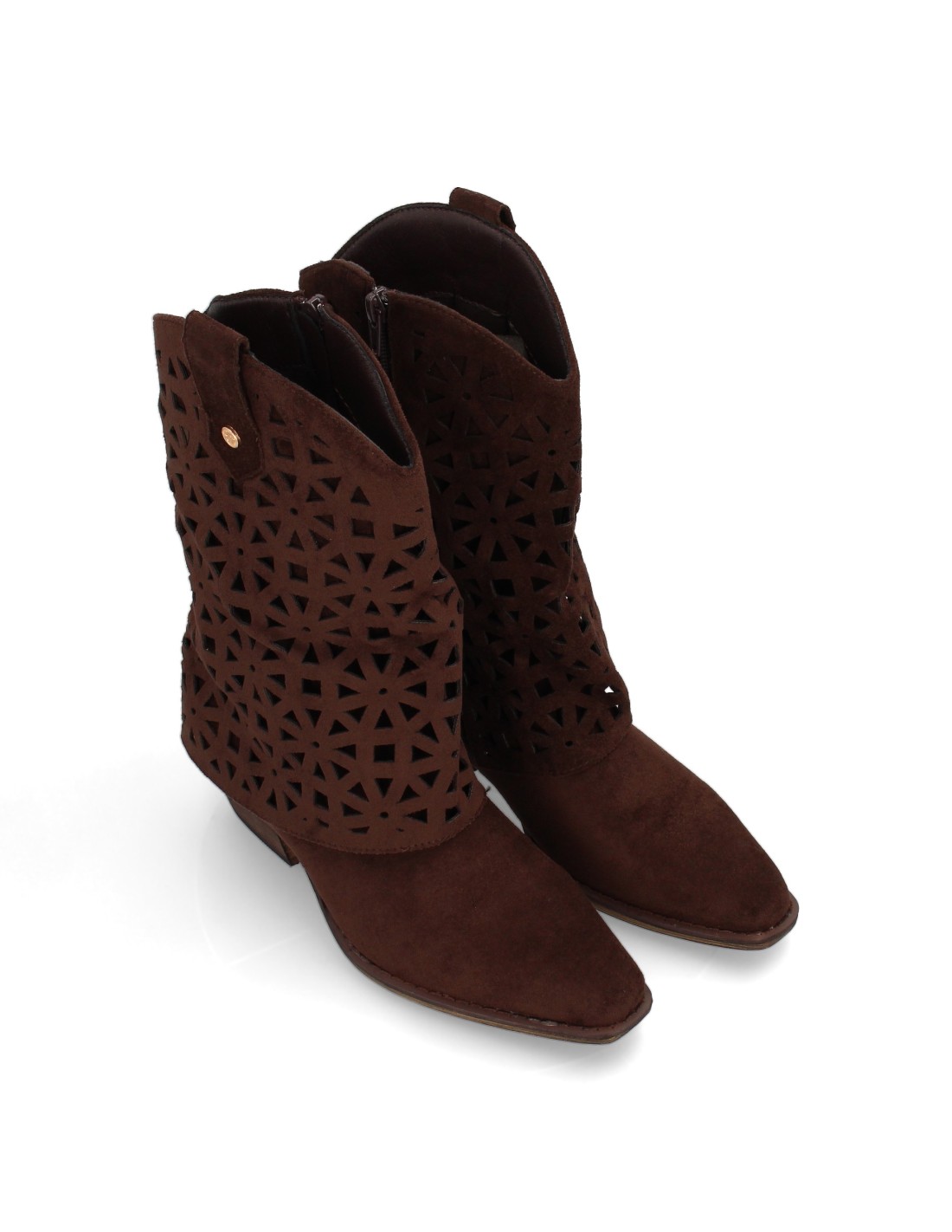 Botas cowboy de media caña para mujer diseño troquelado de formas geométricas que aporta frescura, punta fina y tacón cubano bajo. Estampado liso, Ideal para el día a día.